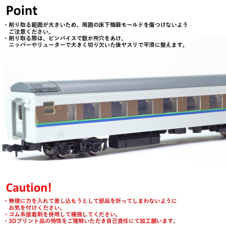 北海道車のロイヤル用床下機器を再現できる3Dプリント品パーツです。既製品の北斗星オロハネ25 550に取り付けてお使いください。