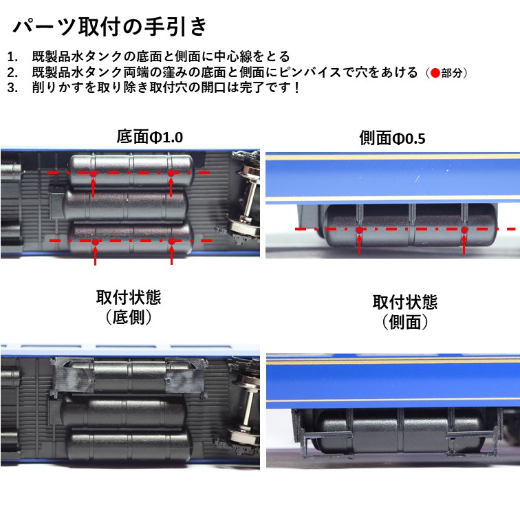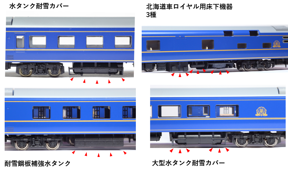 水タンク耐雪カバー:カニ・スシ・オハ・スハネ以外全て耐雪鋼板補強水タンク:オハネ24-500/オハネフ24-500大型水タンクカバー:スシ24-500・オハ25-500/550北海道車ロイヤル用床下機器:オロハネ25-550(北海道車)