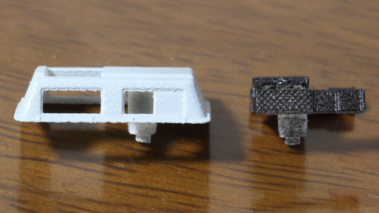 アクリルナチュラルで発注した場合は写真のように白濁した半透明の状態で届きますが、アクリルブラックで発注するとキセも含めて全て黒く染色された状態で届きます。キセをグレーに塗れば本体部分は黒に塗る必要が無く、そのままはめ込めばOKで手軽です。