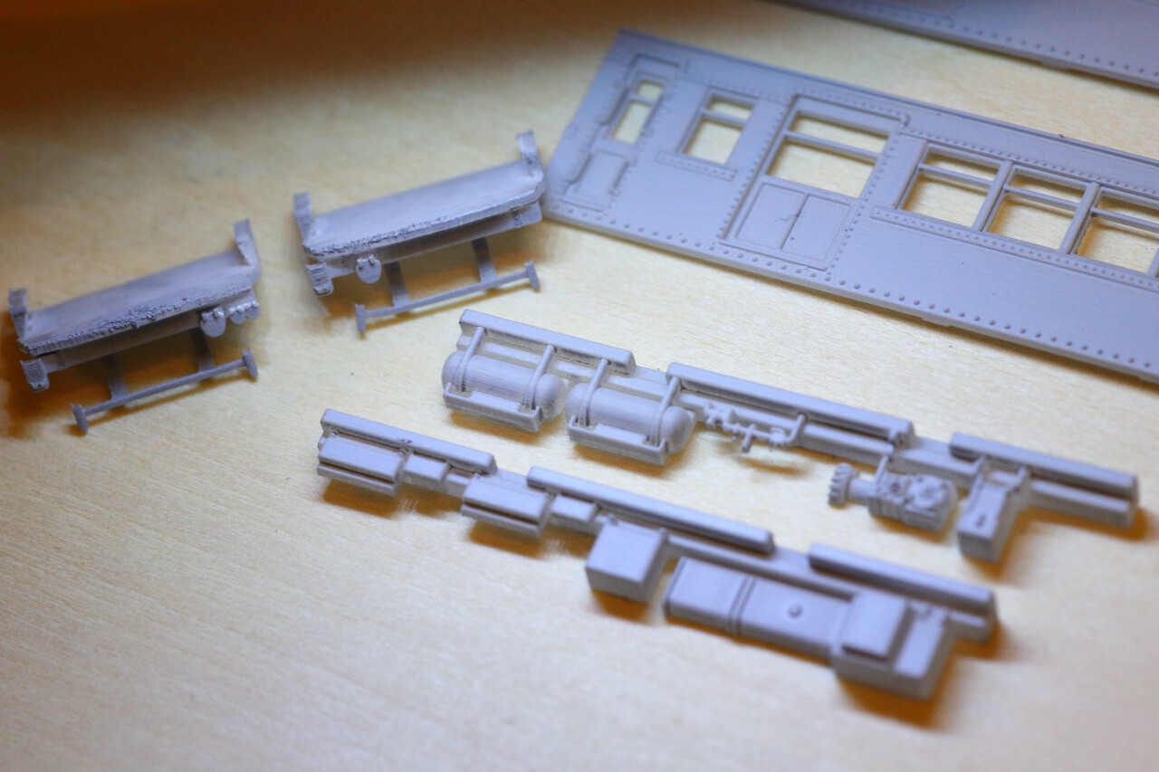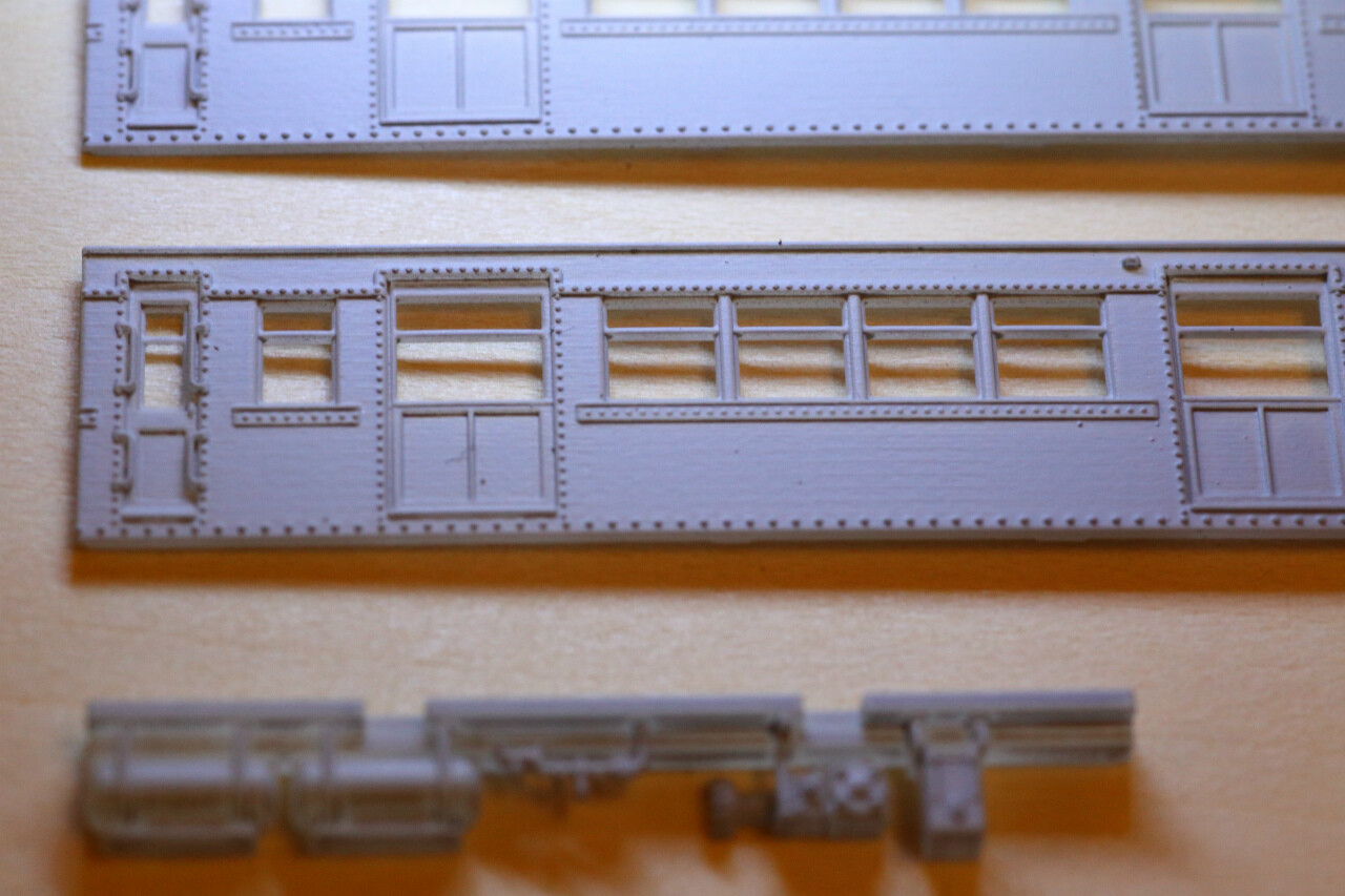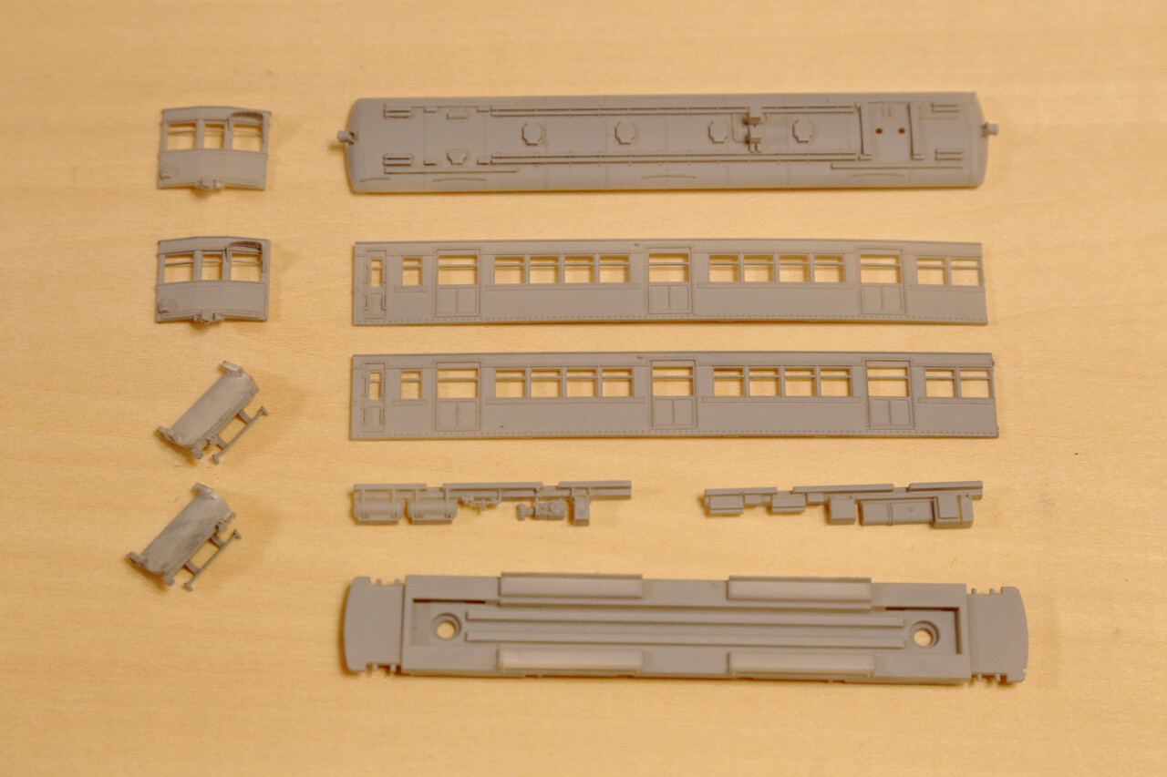 このセットでは、ボディや屋根板だけでなく、床板や床下機器も付属しています。逆に、台車だけはGM D-16台車を使用します。一応日車ボールドウィン台車は設計しておりますが、コロ軸受けのためGM D-16台車の方が形態的に近いのです。