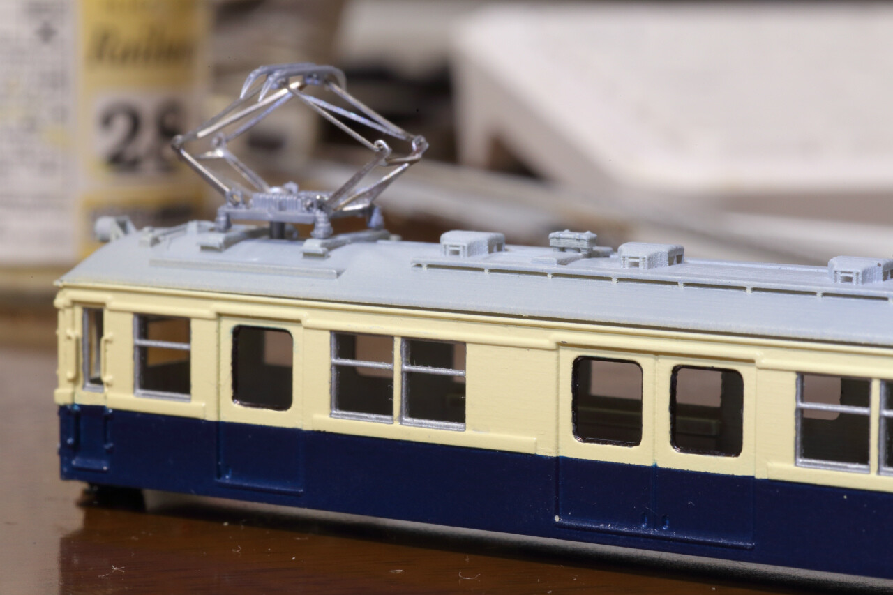 いつもはクレオスの新水性塗料アクリジョンを使用していますが、調色が難しそうなのでGMアイボリーB+ブルーBの定番色を使用しました。アイボリーの発色は噂にたがわぬ悪さで厚塗り気味ですが、実車も重厚感ある塗りですので悪くはないかもしれません。