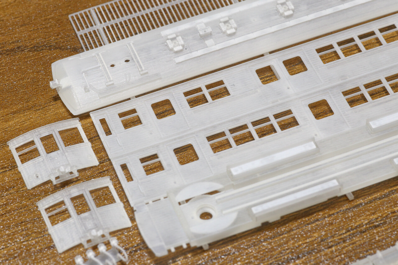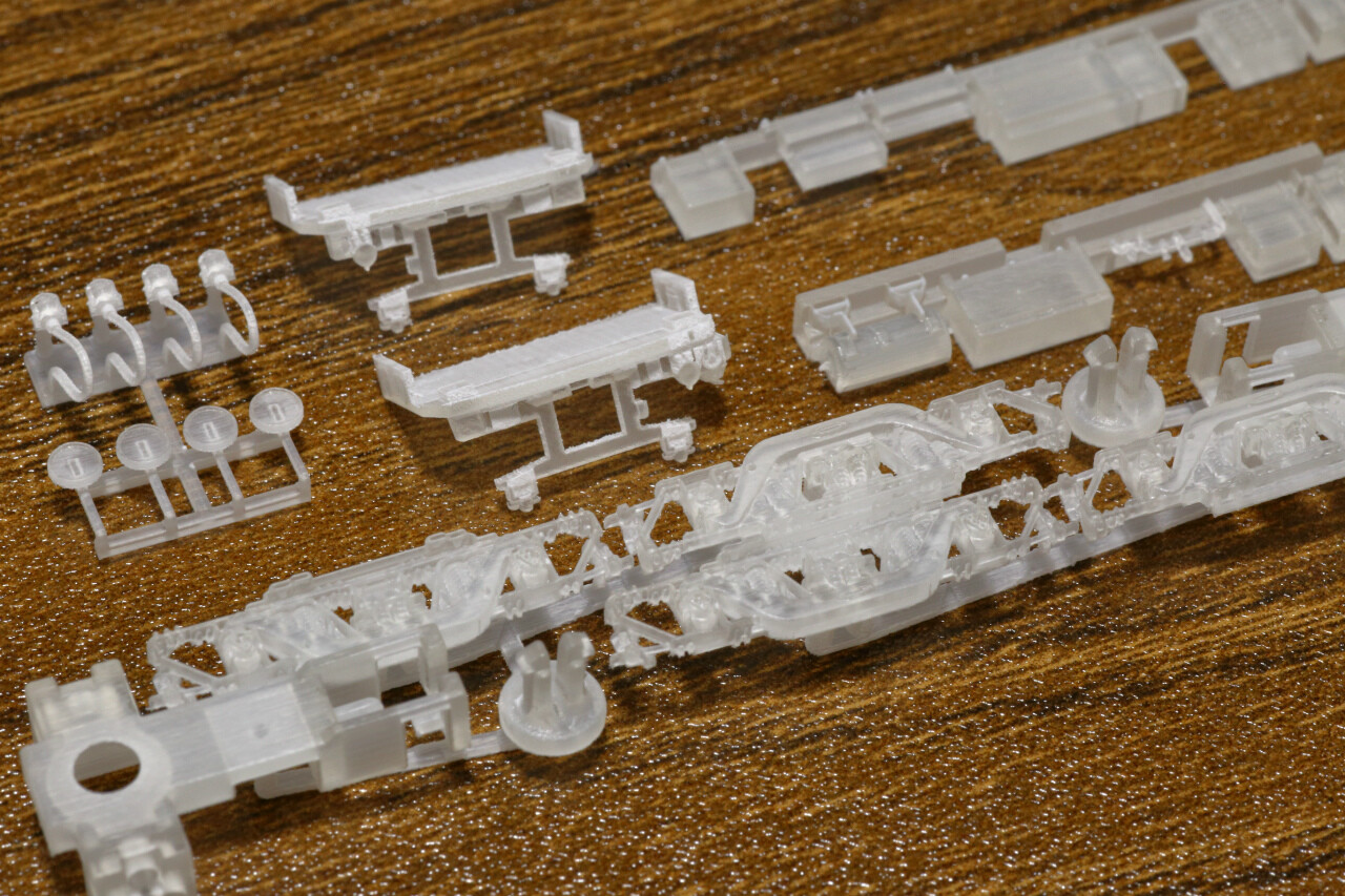 1両分かつ台車等の既製品が皆無に近い状態ということもあり、床下機器や台車枠まで含めたフルセット構成です。